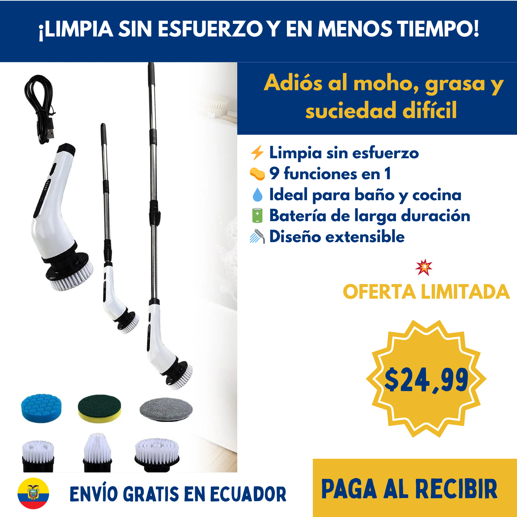 Este cepillo inalámbrico te permite eliminar grasa, moho y suciedad difícil en segundos, gracias a sus 9 cabezales intercambiables y su potente motor de 25 W.
